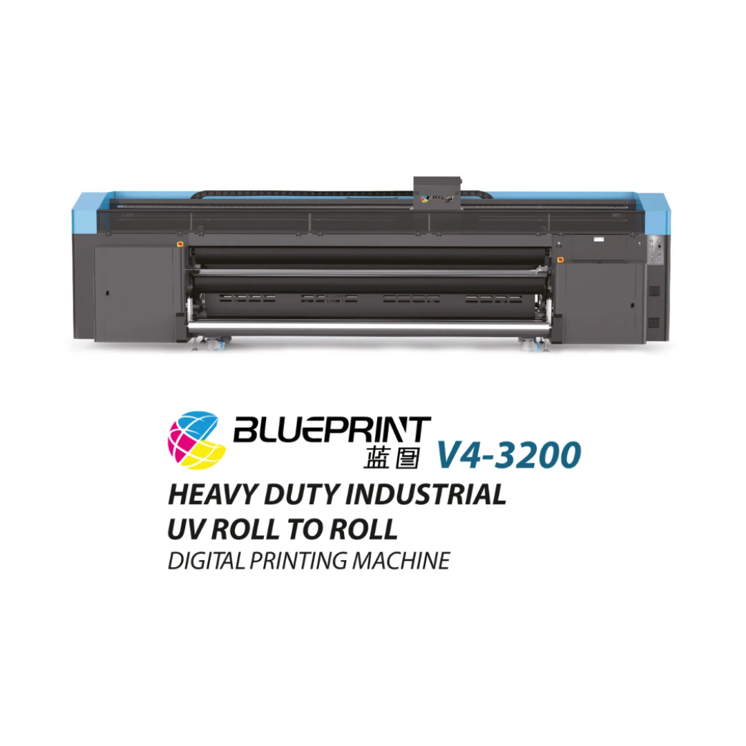 Blueprint V4-3200, 3.2Mtr UV LED Roll to Roll Inkjet Printer delivers high quality, productivity and reliability. It offers a variety of applications to cater indoor & outdoor applications and supports wide range of flexible media like Vinyl, Fabric, Banner, Wallpaper, Canvas, PET, Translit etc. The Blueprint V4-3200 is capable of printing max speed up to 1200sqft/hour.